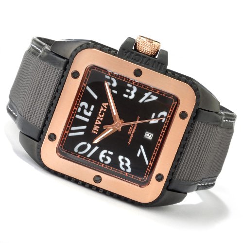 Stainless steel case with a grey technofiber over genuine leather strap. Fixed rose gold-tone bezel. Black dial with rose gold tone hands and Arabic numeral hour markers. Minute markers around the outer rim. Dial Type: Analog. Luminiscent hands and markers. Date display at the 6 o'clock position. Quartz movement. Scratch resistant flame fusion crystal. Solid case back. Case diameter: 43 mm. Case thickness: 13 mm. Band width: 28 mm. Tang clasp. Water resistant at 50 meters. Functions: date, hour, minute, second. Casual watch style. Invicta Rose Gold Tone Quartz Black Dial Mens Watch 1458.